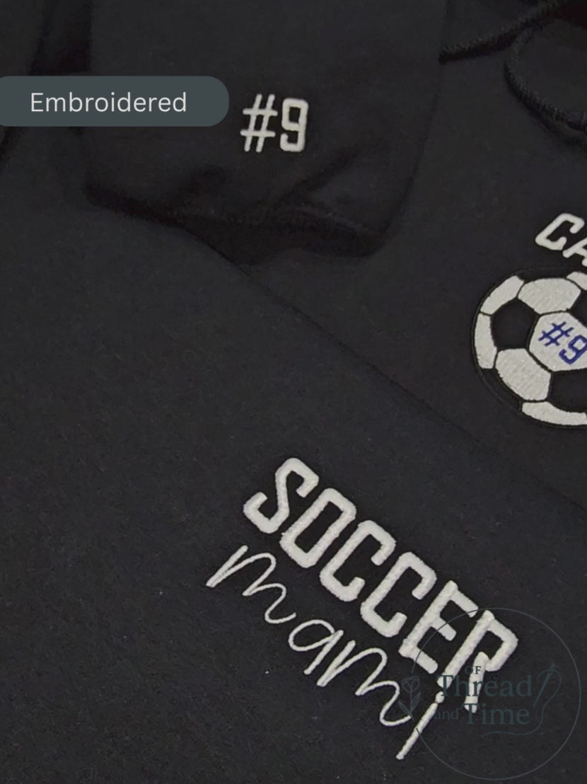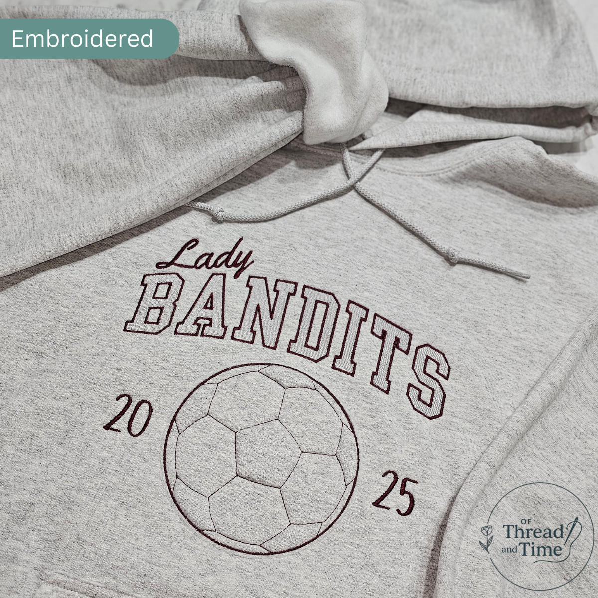 ** This is a custom hoodie, you will need to enter your two thread colors and if it's for the outline/fill on the checkout page in the "Order special instructions" box. (i.e. Black outline, blue fill). Please add what type of ball, team name and year. If you have specific requests, please email me directly at juanita@ofthreadandtime.com so we can discuss details prior to placing your order. If you wish to add a last name to the back of the hoodie, select "customization" button and enter the last name in the "Order special instructions" box as well. DOUBLE CHECK SPELLING.