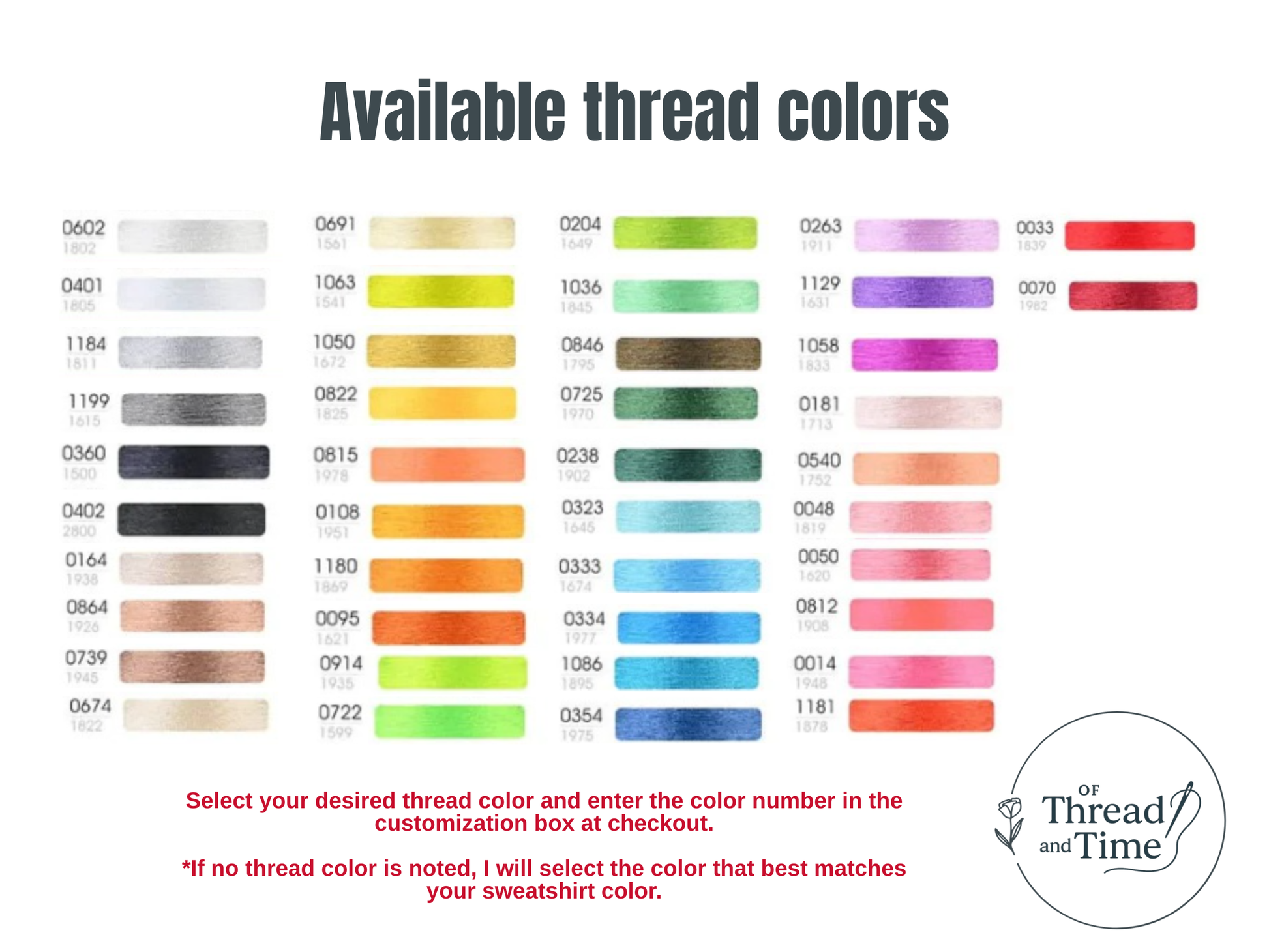 Thread color options are in the listing photos. Please enter the color number of your choosing into the customization box at checkout. If you do not enter a number, I will use the color that closely matches your sweatshirt color.